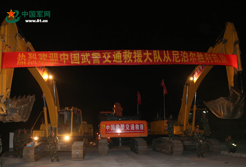 应尼泊尔紧急援助请求,经国务院、中央军委批准,中国武警交通救援大队两个突击分队的500名官兵、180台(套)大型工程机械自3日起赴尼泊尔执行中尼公路东线樟木口岸114公里、西线吉隆口岸至加德满都132公里道路的抢通任务。