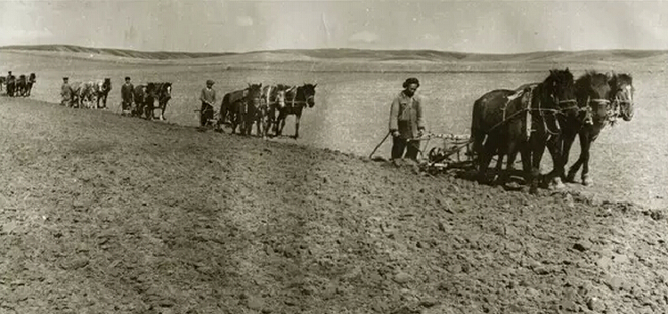 上世纪五、六十年代马拉犁耕地。