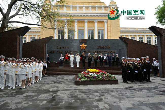 海上联合-2015(Ⅰ)中俄联演双方总导演向纪念碑敬献花圈并检阅俄海军仪仗队