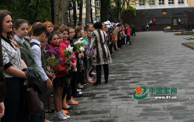 海上联合-2015(Ⅰ)中俄联演双方总导演向纪念碑敬献花圈并检阅俄海军仪仗队