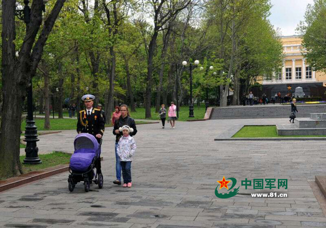 俄军官携母女参加敬献花圈活动后归来