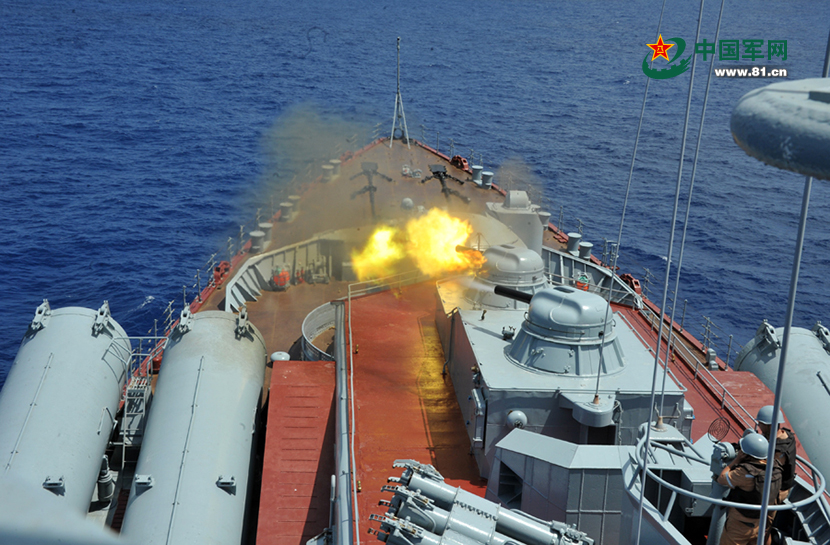 “莫斯科”号导弹巡洋舰副炮开火瞬间。 中国军网记者 郑文达 摄