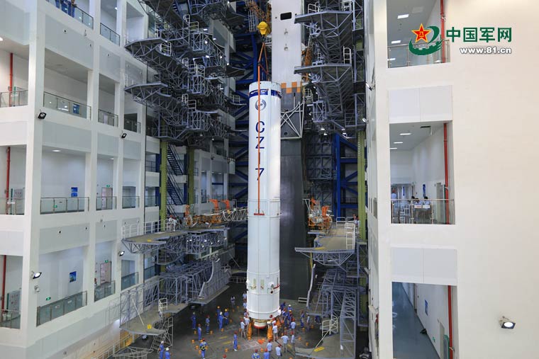 长征七号遥一火箭在垂直总装测试厂房总装