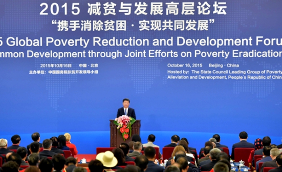 10月16日,2015减贫与发展高层论坛在北京人民大会堂举行。国家主席习近平出席论坛并发表题为《携手消除贫困促进共同发展》的主旨演讲。 新华社记者 李涛 摄