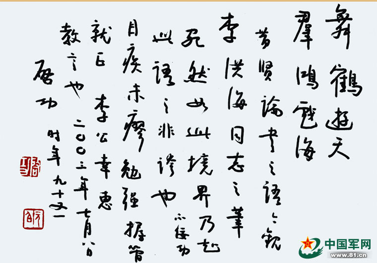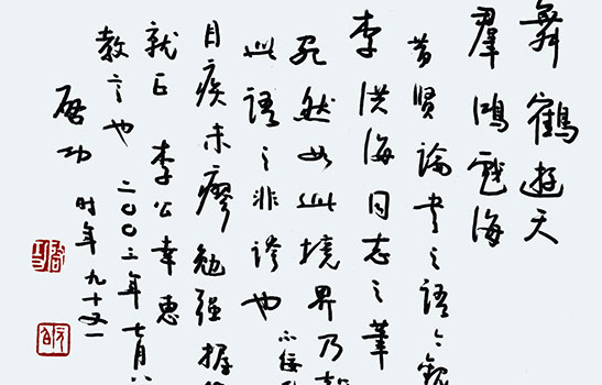 昔贤论书之语,今观李洪海同志之笔,宛然如此境界,乃知此语之非夸也!不侫功目疾未瘳,勉强握管,就正。李公幸惠,教言也。