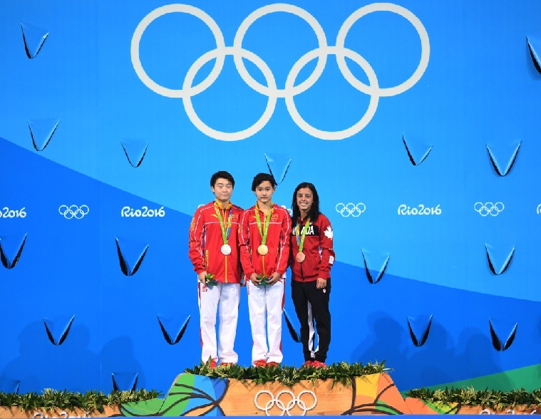 8月18日,中国选手任茜(中)、司雅杰(左)和加拿大选手本费托在颁奖仪式上。新华社记者程敏摄