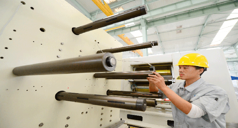 河北邢台纳科诺尔精轧科技股份有限公司工人在车间安装调试轧机设备(2015年10月14日摄)。
