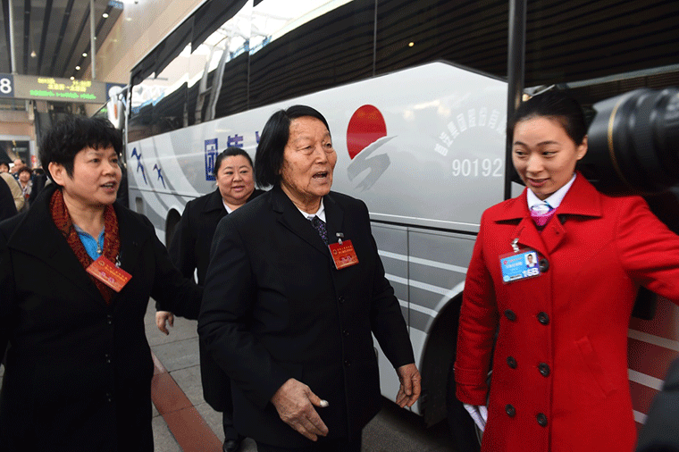3月2日,出席十二届全国人大四次会议的山西代表团乘坐火车抵达北京西站。这是申纪兰代表(右二)准备乘车前往驻地。