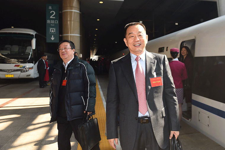 3月2日,出席十二届全国人大四次会议的河南代表团乘坐火车抵达北京西站。这是李士强代表(前右)走上站台。