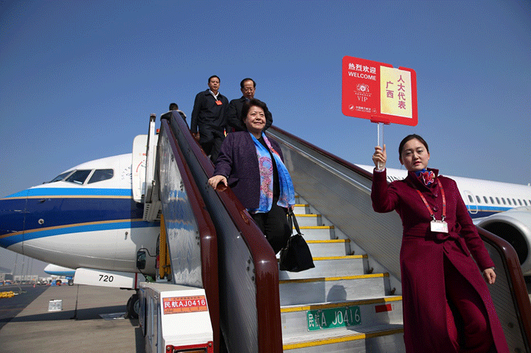 3月2日,出席十二届全国人大四次会议的广西代表团乘坐飞机抵达北京。