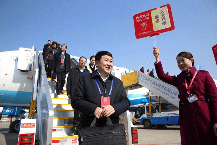 3月2日,出席十二届全国人大四次会议的福建代表团乘坐飞机抵达北京。