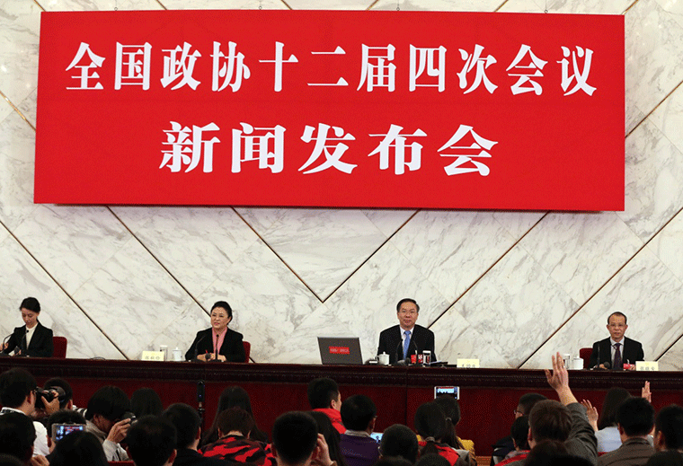 3月2日,全国政协十二届四次会议新闻发布会在北京人民大会堂举行,大会新闻发言人王国庆介绍会议有关情况并回答中外记者提问。