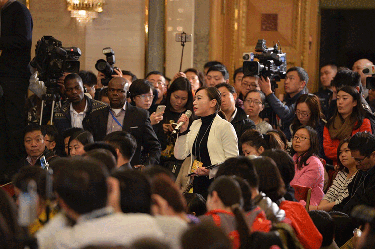 3月2日,全国政协十二届四次会议新闻发布会在北京人民大会堂举行,大会新闻发言人王国庆介绍会议有关情况并回答中外记者提问。这是记者在发布会上提问。