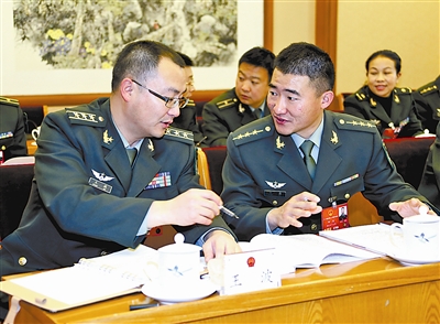 3月6日,解放军代表团小组审议政府工作报告。图为会议间隙军队人大代表王波(左)、田鑫进行讨论交流。本报记者 穆可双摄