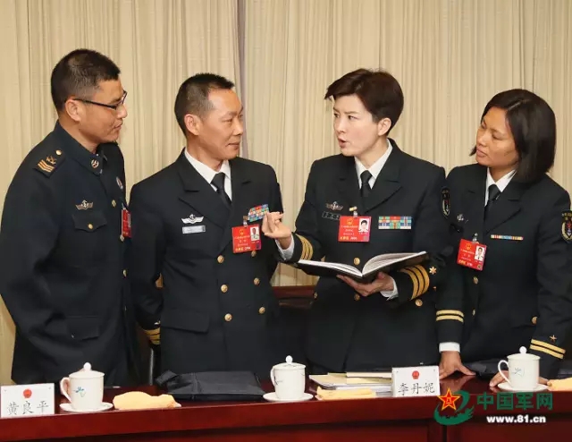 3月6日,解放军代表团小组审议政府工作报告。图为会议间隙,来自海军基层部队的军队人大代表黄良平、华明、李丹妮、文敏(从左至右)围绕热点问题进行讨论交流。解放军报记者 穆可双 摄