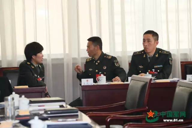 3月6日上午,解放军代表团小组审议政府工作报告。图为会议结束后,军队人大队表围绕热点问题展开讨论。解放军报记者 穆可双 摄
