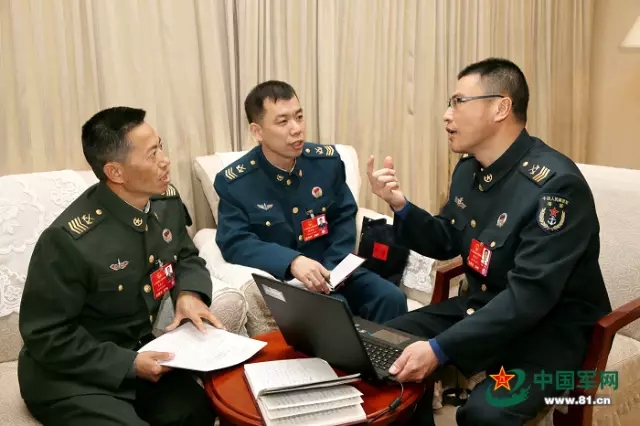 3月4日,十二届全国人大四次会议在北京人民大会堂举行预备会议。图为会议结束后军队人大代表王忠心、杜洪强、黄良平(从左至右)共同讨论提交大会的建议。解放军报记者 穆可双 摄