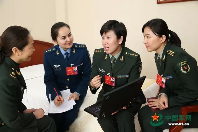 3月3日,出席十二届全国人大四次会议的军队人大代表蔡红霞、米合伦沙·阿不都、王方、王娜(由左至右)向大会报道后,相约到一起共同讨论提交大会的建议。解放军报记者 穆可双 摄