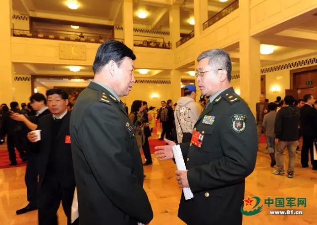 3月3日下午,军队政协委员魏积安(左)、于海在开幕会结束后讨论全国政协常委会工作报告。解放军报记者 穆瑞林 摄