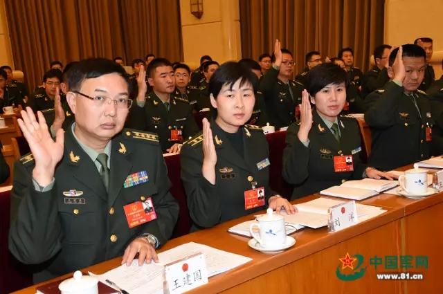 3月3日,十二届全国人大四次会议解放军代表团成立大会召开。图为代表们举手表决。解放军报记者 冯凯旋 摄