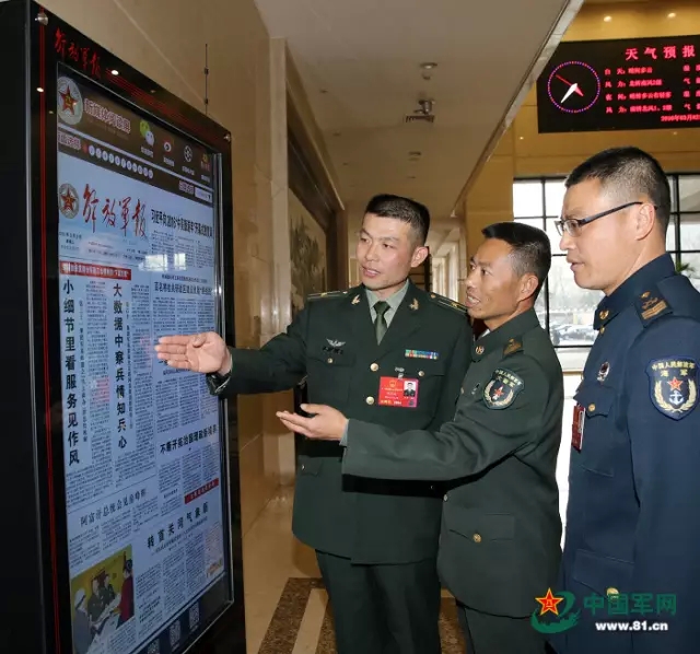 3月2日,出席十二届全国人大四次会议的代表们陆续向大会报到。这是军队人大代表(由左至右)韩庆波、王忠心、黄良平、王海龙向大会报到后,在《解放军报》电子阅报屏前阅读《解放军报》。解放军报记者 穆可双 摄