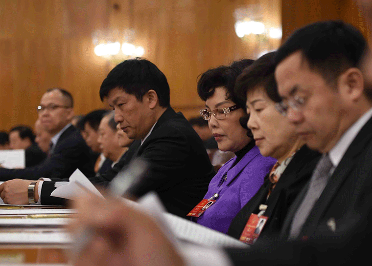 3月9日,十二届全国人大四次会议在北京人民大会堂举行第二次全体会议。这是代表在认真听会。