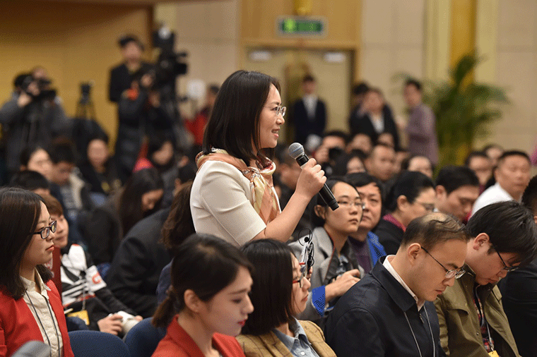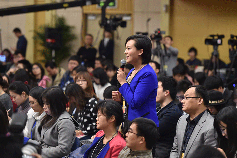3月9日,全国政协十二届四次会议在北京梅地亚两会新闻中心召开记者会,这是中国教育电视台记者在记者会上提问。