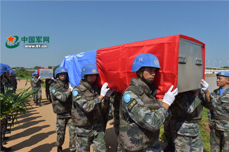 我维和营官兵将战友的遗体护送上车。