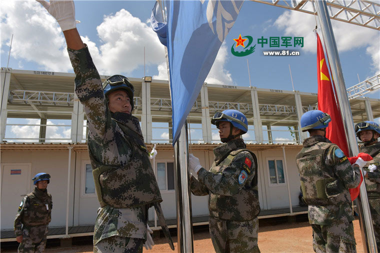 在我维和营为两名烈士举行的追悼会上,旗手升起联合国旗。
