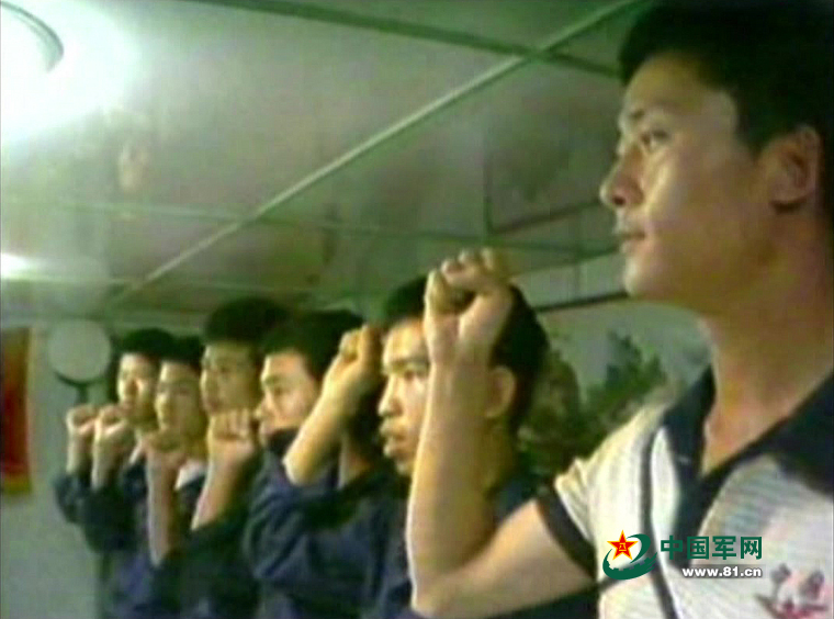 当年的海战前,杨志亮与战友们一起宣誓。 (录像画面截图)