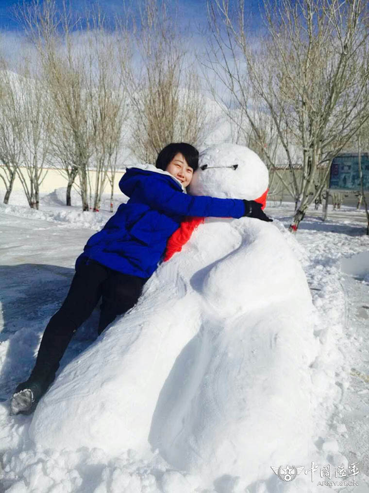 瞧,军嫂和自己堆的雪人合影