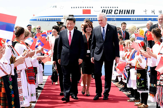 6月17日,国家主席习近平乘专机抵达贝尔格莱德,开始对塞尔维亚共和国进行国事访问。习近平和夫人彭丽媛在机场受到塞尔维亚总统尼科利奇夫妇的热情迎接。新华社记者 饶爱民 摄