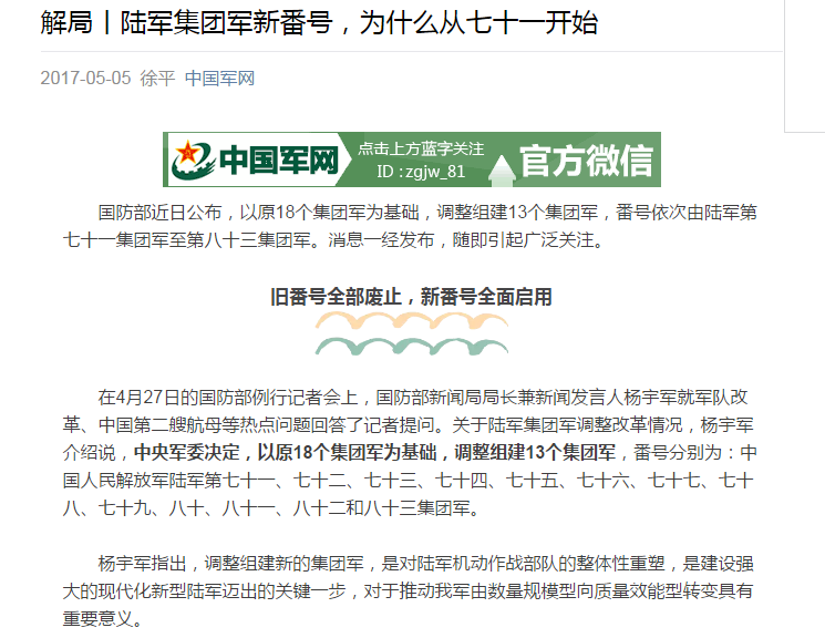 10天之后,国防部例行记者会披露,陆军18个集团军番号撤销,调整组建后的13个集团军番号同时公布。