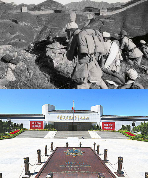 上图为抗日战争中人民军队浴血奋战,下图为中国人民抗日战争纪念馆。