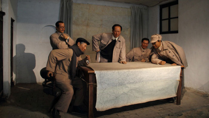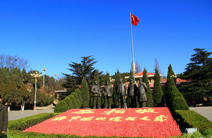 五位领导人铜铸像,位于西柏坡纪念馆广场中央,均高2.5米,青铜铸像,艺术地再现了西柏坡时期中国共产党第一代领导集体充满胜利的喜悦和对未来无限憧憬的情景。