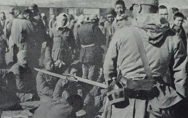 图为放下武器投降的中国军人被双手反绑,像牲口一样遭日军屠杀。