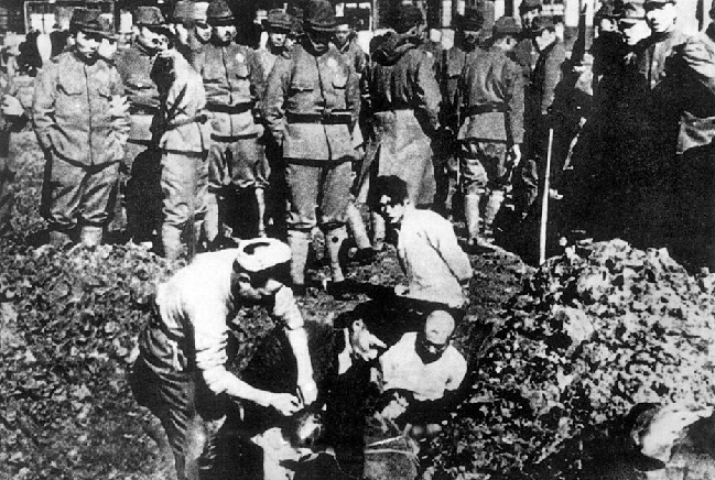 “日本人命令每一个难民都必须亲自登记,而且要在10天内完成……20万人!怎么办?整批年轻力壮的男人已经被拉了出去,他们的命运不是做奴工就是死亡。还有整批的年轻女子被拉出去,因为要成立一个很大的军中妓院。”图为日军坑杀南京市民。