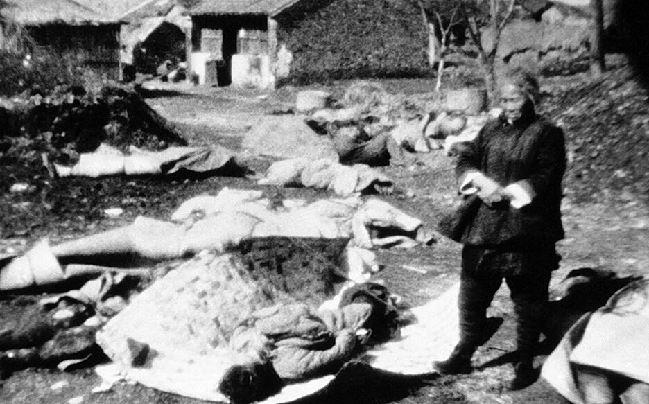 “一个漂亮女子的母亲向我奔过来,双膝跪下,不断哭泣着,哀求我帮她一个忙。当我走进一所房内,我看见一个日军全身赤裸裸地趴在一个哭得声嘶力竭的少女身上。我立即喝住那个下流无耻的日军,并用任何能够让人明白的语言向他呼喝。他丢下一句“新年快乐”就逃走了。”图为在居民区被杀害的平民。