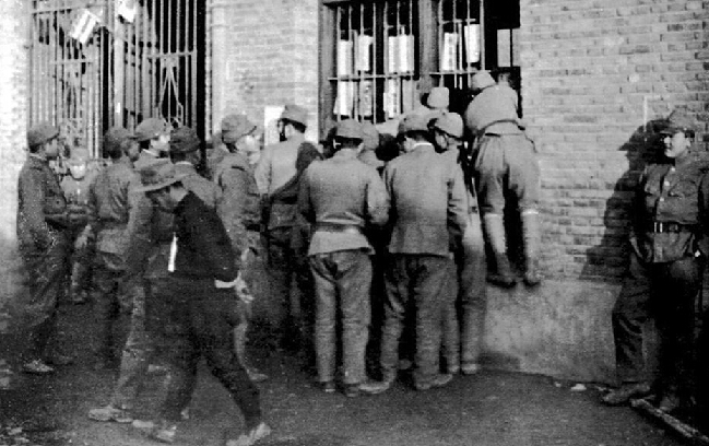 1938年1月,日军在南京开设慰安所,图为日军官兵拥挤在慰安所旁。