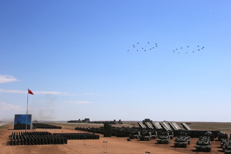 7月30日,庆祝中国人民解放军建军90周年阅兵在位于内蒙古的朱日和训练基地举行。中共中央总书记、国家主席、中央军委主席习近平检阅部队并发表重要讲话。这是纪念标识梯队。新华社记者 查春明 摄