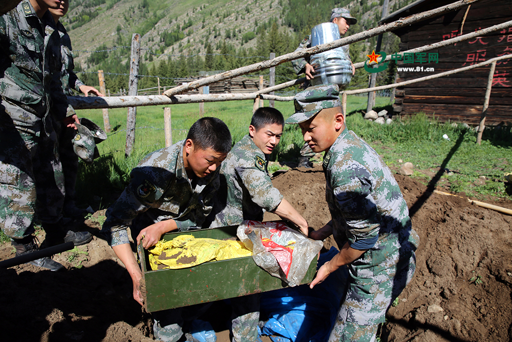 官兵们将头一年埋藏的锅碗瓢盆挖出。