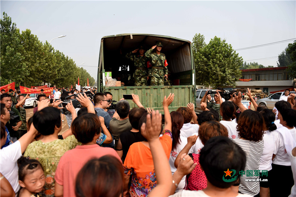 2016年8月4日,河北省邢台市七里河群众依依不舍欢送参加抗洪抢险任务的武警水电部队官兵归建。