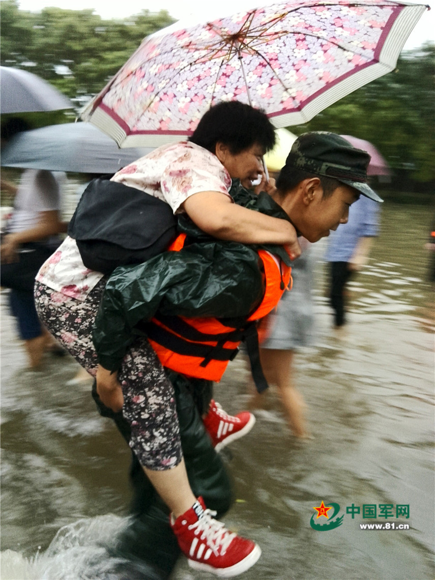 武警北京总队官兵帮助行动不便的行人通过复杂水路段。焦一鸣 摄
