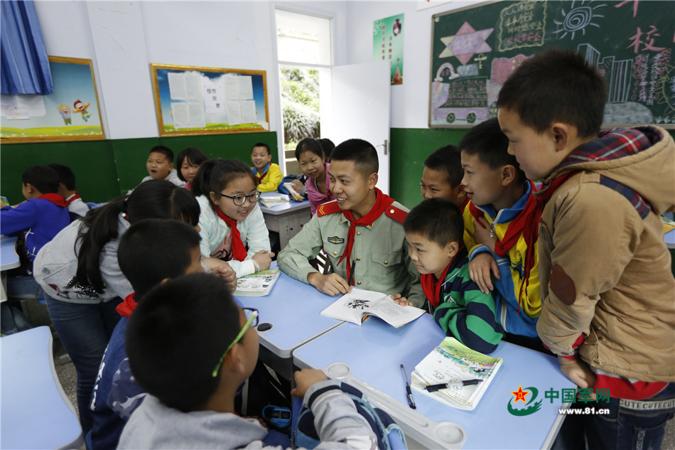 武警重庆总队四支队官兵为驻地小学生进行国防教育。
