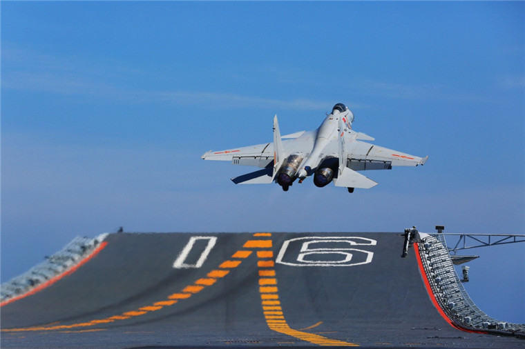 一架歼-15舰载战斗机从辽宁舰滑跃起飞(2017年7月1日摄)。新华社记者 曾涛 摄