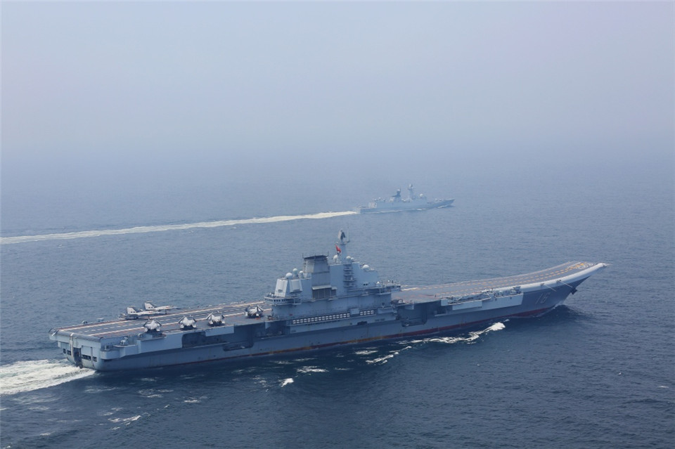 7月13日,辽宁舰(下)与烟台舰在某海域机动航行。新华社记者 曾涛 摄