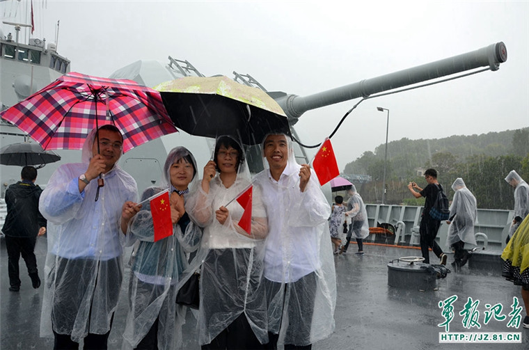 华人华侨冒着大雨在长春舰参观,并在前甲板上合影留念。记者 严贵旺 摄
