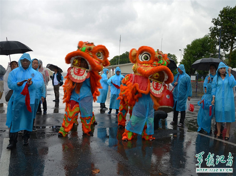 华人华侨雨中舞狮,热情欢迎编队到访。记者 严贵旺 摄