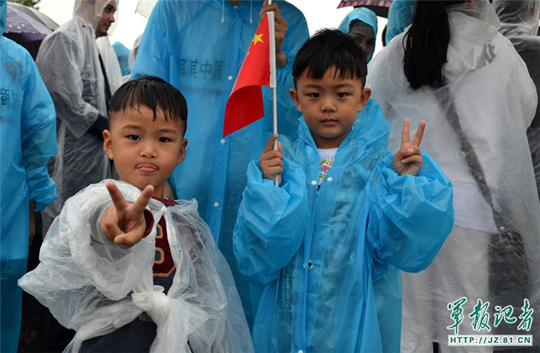 码头上,两位华人小朋友穿着雨衣欢迎祖国海军官兵。记者 严贵旺 摄