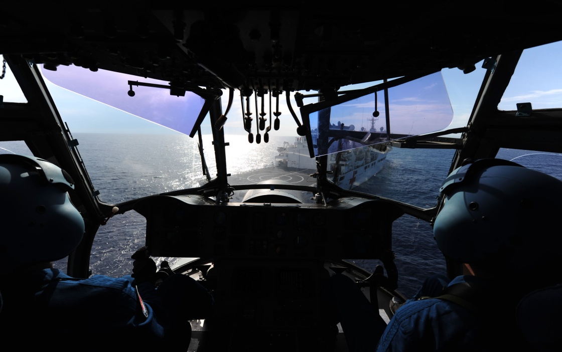 当地时间9月7日14时30分至20时30分,正在执行“和谐使命-2017”任务的海军和平方舟医院船组织救护直升机在地中海某海域进行跨昼夜飞行。这是我海军救护直升机首次在地中海进行跨昼夜飞行训练。